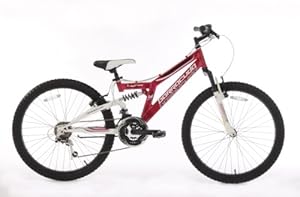 A stylish bike guaranteed to bring a smile to any youngsters face. Exclusive Dual-Suspension Frame built using Quad-Section tubing for great looks, Alloy-cased Rear Shock Unit, Shimano 18-Speed Indexed Gears with Micro shift Rotational Changers, Zoom Suspension Fork, Black 24" Alloy Rims with Black Spokes, Sports Saddle with Alloy Quick-Release Seat Post. A junior bike designed and built with real care and attention and which handles just like a full-sized adult suspension bike!